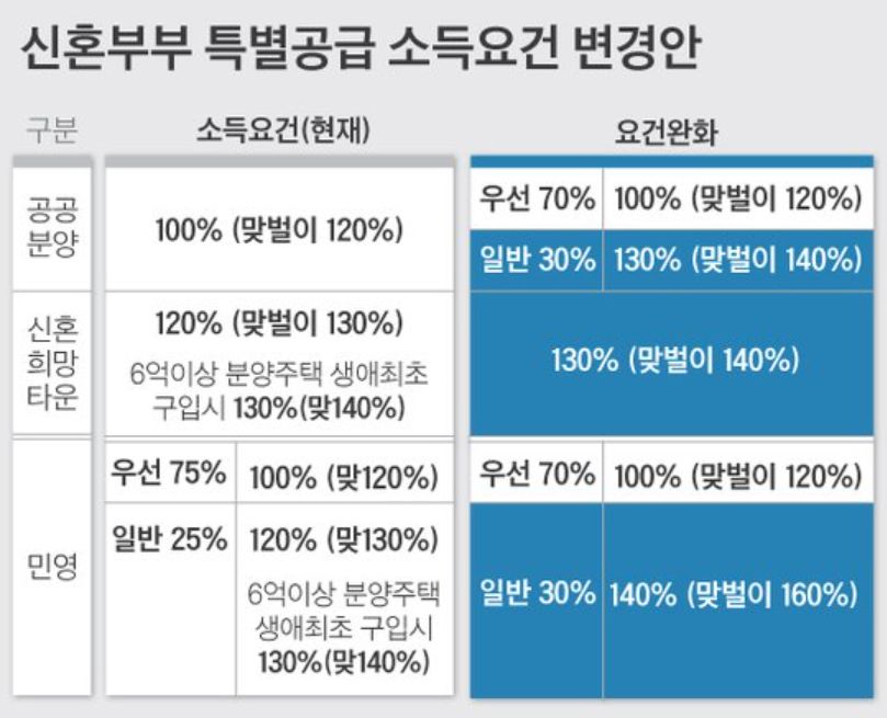 신혼특공 소득기준이 2021년 부터 완화되었습니다. 도시근로자의 월평균 소득의 백분율로 소득기준이 나눠지는데요. 공공주택은 최대 140%, 민영주택은 160%까지 신혼특공 신청이 가능합니다.
