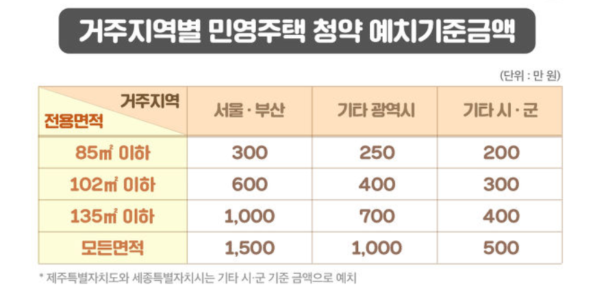- 민영주택의 경우 지역별/평형별로 필요한 예치금이 있습니다. 해당 예치금은 입주자 모집공고일 전까지 청약통장에 예치되어 있어야 합니다.