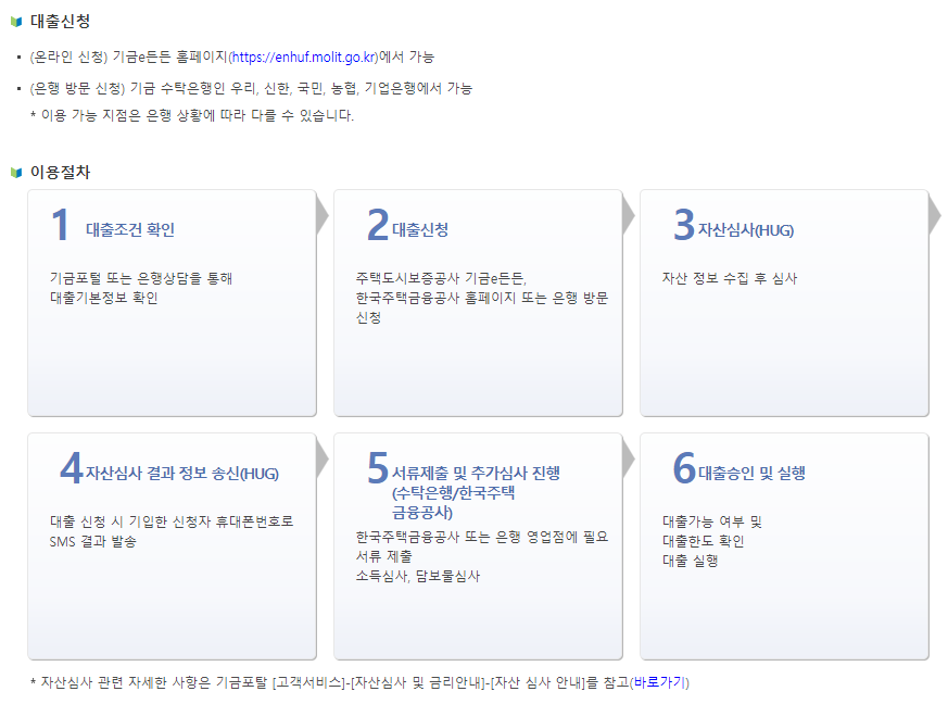 대출신청은 기금e든든 홈페이지나 은행에 방문하여 가능합니다.