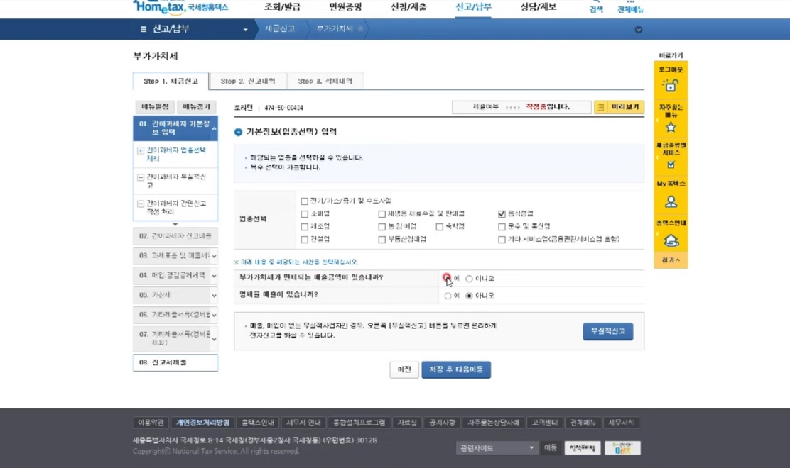 업종은 사업자등록을 하셨을때 업종으로 하시면 되고, 부가가치세 면제되는 매출금액이나, 영세율 매출은 일반적으로 아니요를 선택하시면 됩니다. 지난해 매출실적이 없었다면 무실적신고를 클릭합니다.