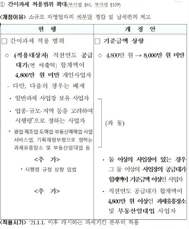 간이과세자의 부가가치세 납부의무 면제기준도 3,000만원에서 4,800만원으로 상향됩니다.