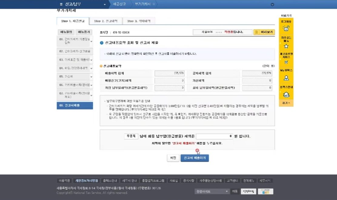 마지막으로 본인이 입력한 신고내역을 바탕으로 매출세액과 공제세액, 가산세 등을 확인합니다. 최종 납부할 세액을 확인해보시고, 신고서 제출을 하시면 됩니다.
