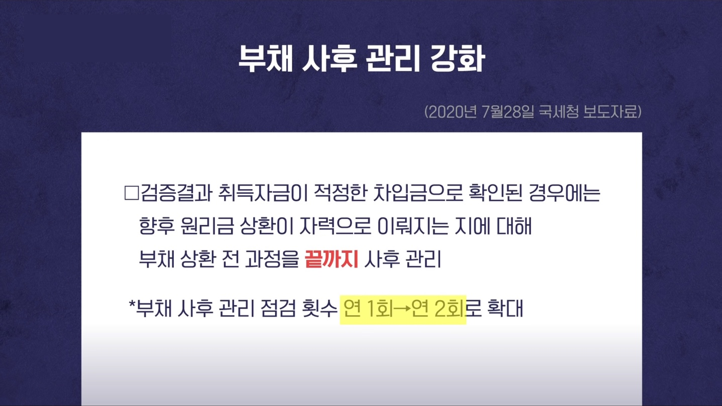 국세청은 보도자료를 통해 대출·임대보증금을 낀 주택 편법증여에 대한 전수조사를 진행할 것이라고 밝혔습니다. 부채 상환 전 과정을 끝까지 사후 관리 한다고 하니, 이점 꼭 참고하시기 바랍니다.