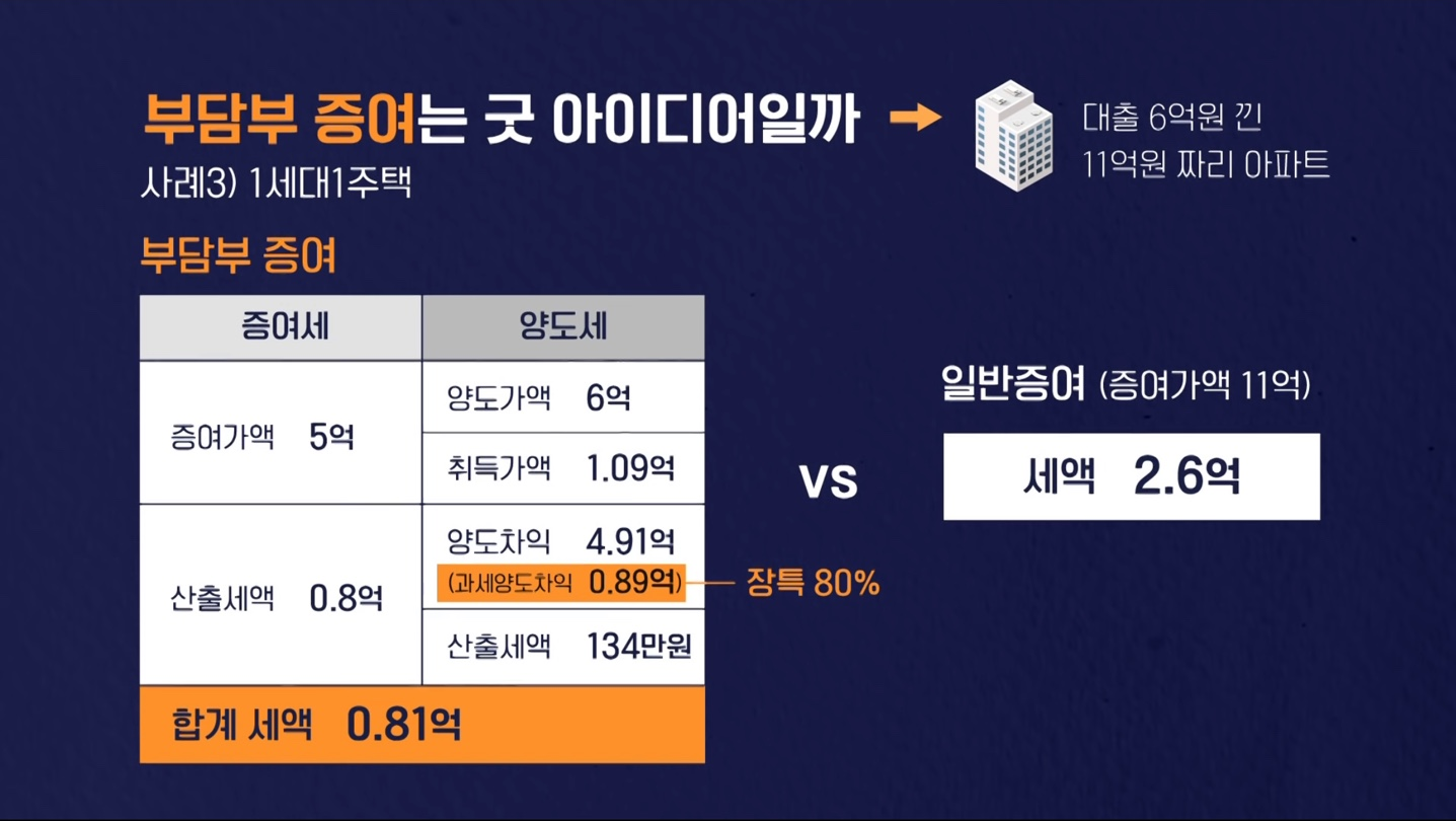 그래도 계산을 해보면, 1세대 1주택으로 양도소득세 비과세 요건을 충족하기 때문에, 일반증여보다 부담부증여가 유리합니다.