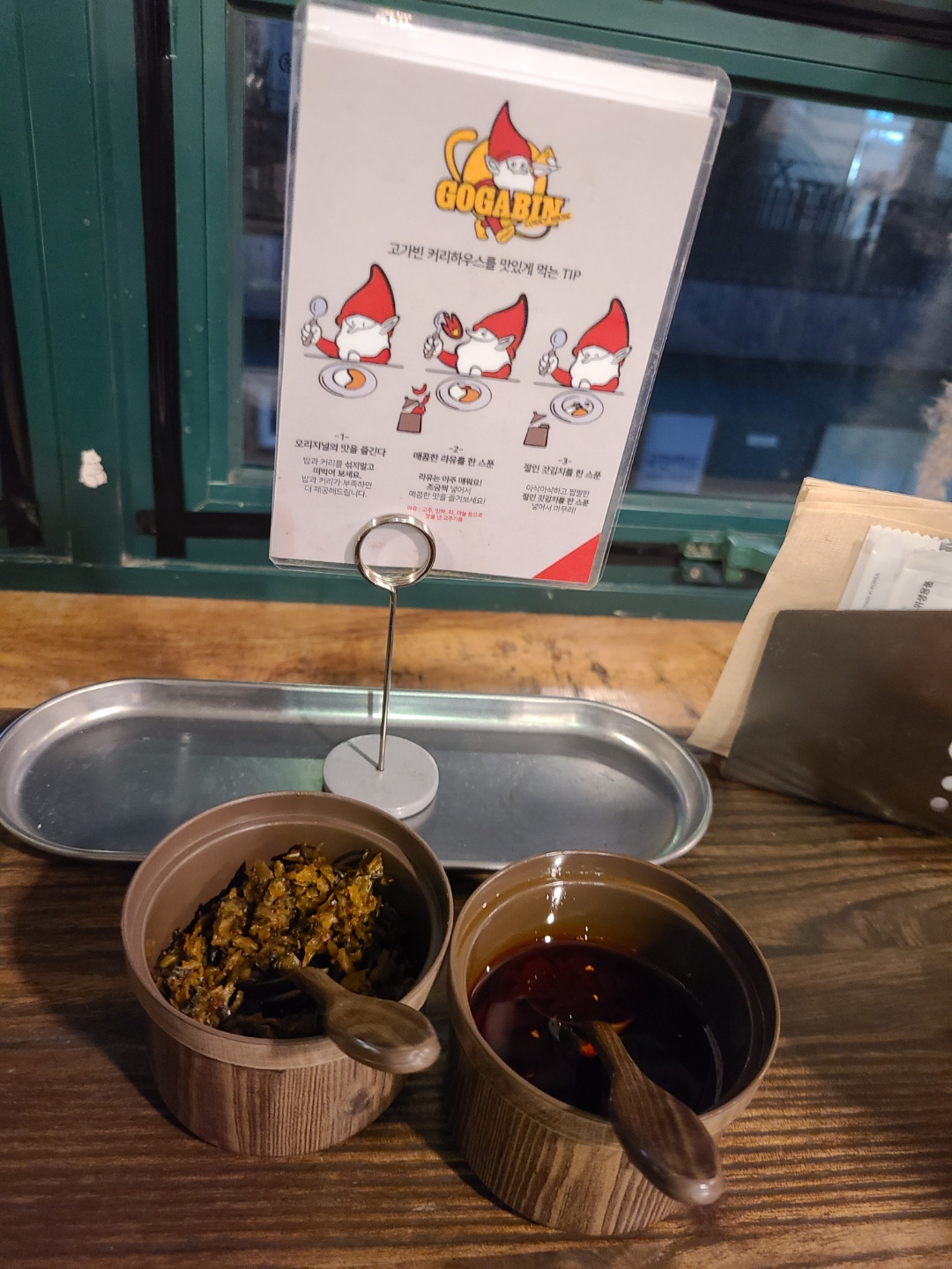 고가빈커리를 더욱 맛있게 즐길 수 있는 방법이 적혀있습니다. 우선 그냥 오리지널로 먹고, 매콤함을 느끼고 싶다면 라유를 뿌립니다. 마지막으로 절인 갓김치도 같이 먹습니다.
