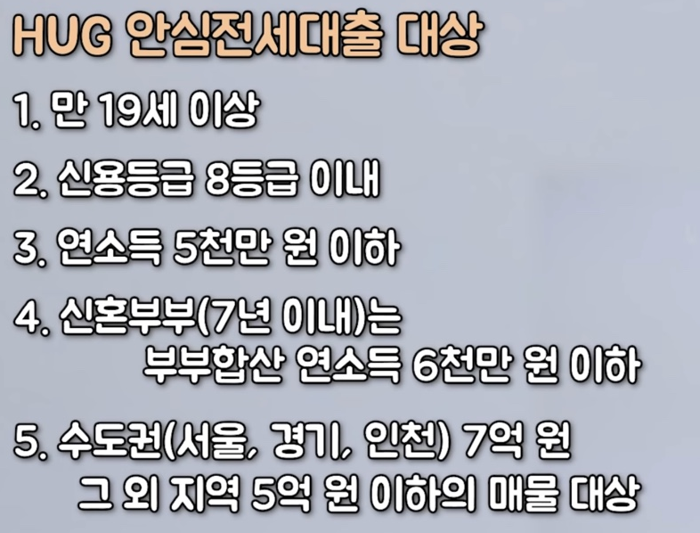 HUG 안심전세대출의 대상은 매우 간단합니다. 만 19세 이상, 신용등급 8등급 이내면 됩니다. 소득조건이 있는데, 연소득 5천만원 이하, 신혼부부는 부부합산 연소득 6천만원 이하입니다.