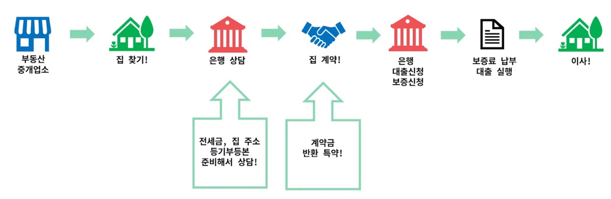 부동산중개업소를 통해 집을 찾고, 은행 상담과 집 계약 후, 은행 대출신청과 보증신청을 합니다. 집 계약시에는 꼭 계약금 반환 특약을 이야기하시는게 좋습니다.