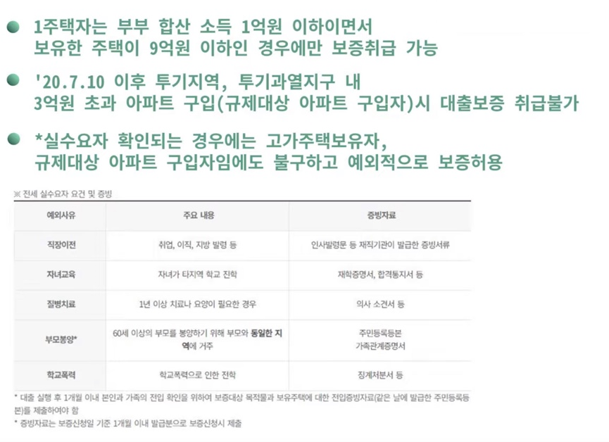 7·10 대출 이후, 안심전세대출의 제한 조건이 생겼습니다. 1주택자는 부부 합산 소득 1억원 이하이면서, 보유한 주택이 9억원 이하인 경우에만 보증취급이 가능합니다. 또한, 조정지역이나 투기과열지구의 3억 초과 아파트 구입 시, 대출보증 취급이 불가합니다.