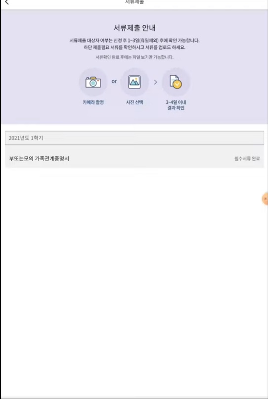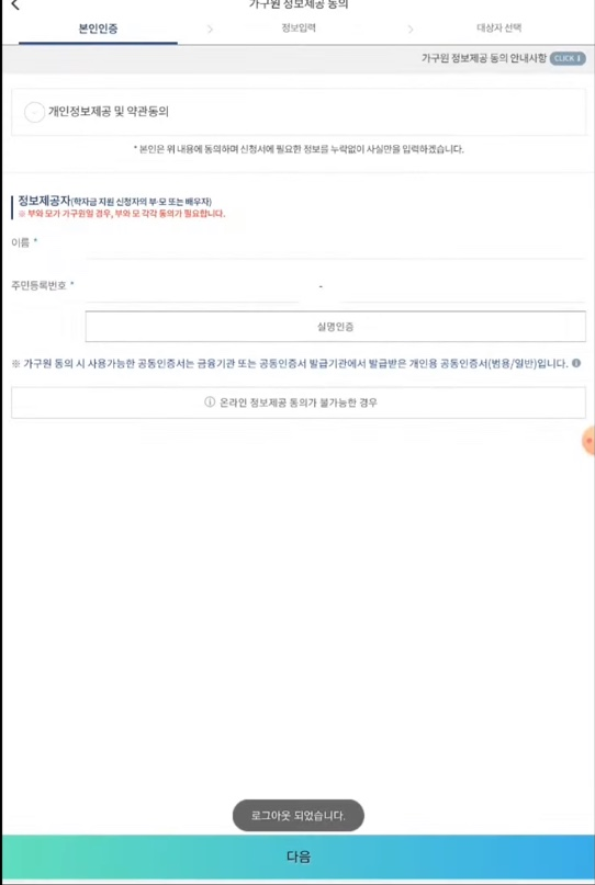 마지막으로 가족관계증명서를 받으셔서, 카메라로 찍어서 서류 제출을 합니다. 또한 가구원(부모님 또는 배우자)의 이름과 주민등록번호를 넣어서 실명인증 및 정보제공 동의를 하면 끝이 납니다.