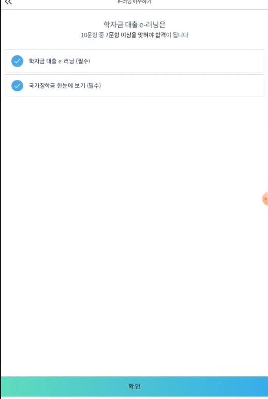 이제 국가장학금 원클릭 신청을 하면 됩니다. 학부정보를 입력하시고, 원하시는 국가장학금 신청 유형을 누릅니다. 약관 동의와 신청 정보까지 등록하시면, e-러닝을 이수하셔야 합니다.