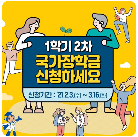 국가장학금 2차 신청이 시작되었습니다. 지난 2월 3일 부터 3월 16일까지 기간이 이어지는데요. 이번 2차 접수에서는 2021학년도 신입생뿐만 아니라, 1차 신청기간을 놓친 재학생들도 신청이 가능합니다.