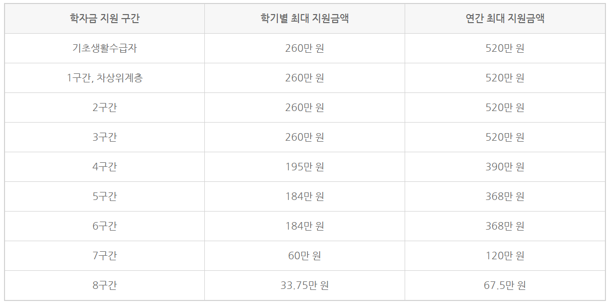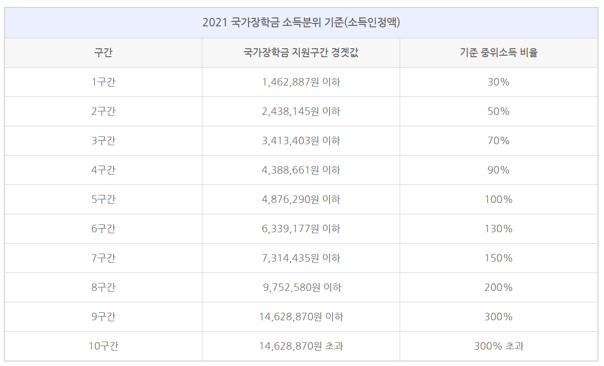 국가장학금은 소득분위 기준에 따라 지원받을 수 있는 금액이 달라집니다. 지원구간(소득분위)는 가구원의 소득 및 금융자산, 부채 등의 재산을 소득으로 환산한 금액의 합계인 월 소득인정액으로 결정됩니다. 총 1구간부터 10구간 까지로 나뉩니다.