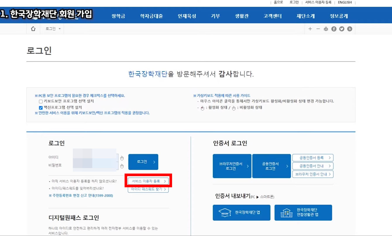 우선 한국장학재단 홈페이지에 들어가셔서, 회원가입을 먼저 해주셔야 합니다. 로그인 페이지에 가시면, 서비스 이용자 등록이라는 버튼이 있습니다. 이를 누르시고, 만 14세 이상 국내인으로 주민번호 실명 인증을 하시면 ID/PW를 만들 수 있습니다.