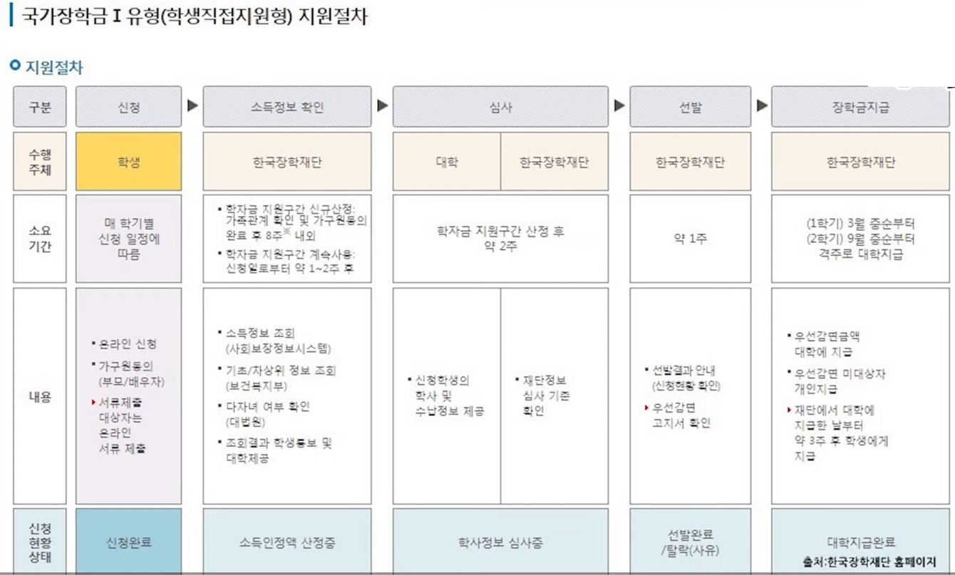 지금부터 국가장학금 1유형 신청방법을 알아보겠습니다. 우선, 신청절차는 위의 사진을 보시면 대략적으로 알 수 있습니다.