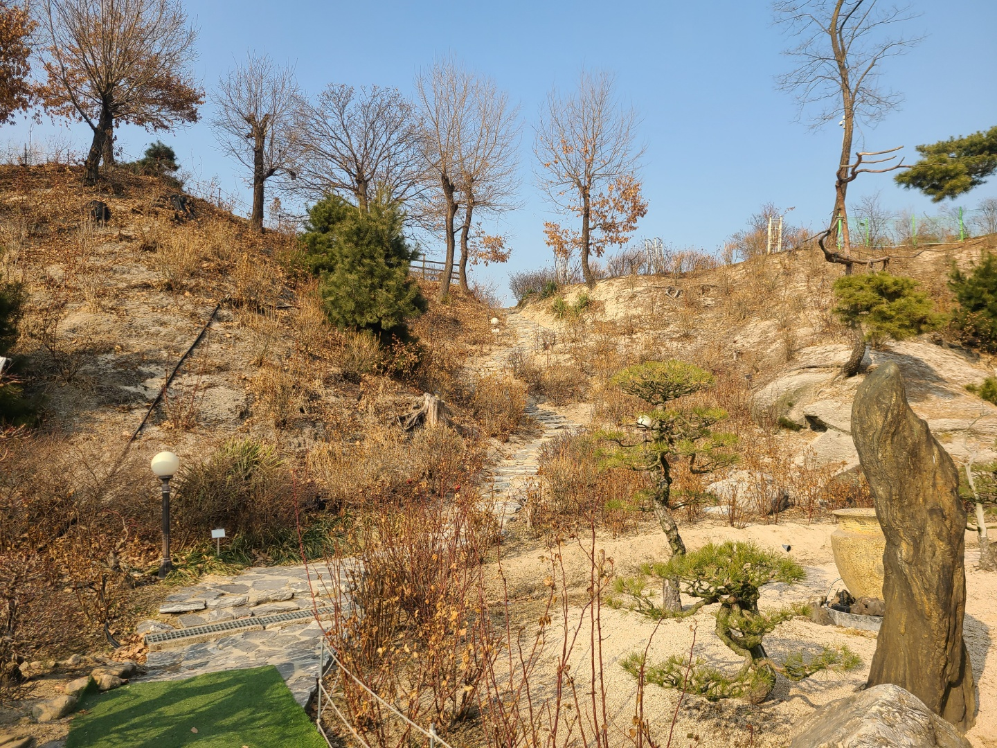 언덕을 지나면, 멀리 도봉산이 보입니다. 메이다이닝은 넓은 잔디밭과 소나무가 심어져 있습니다.
