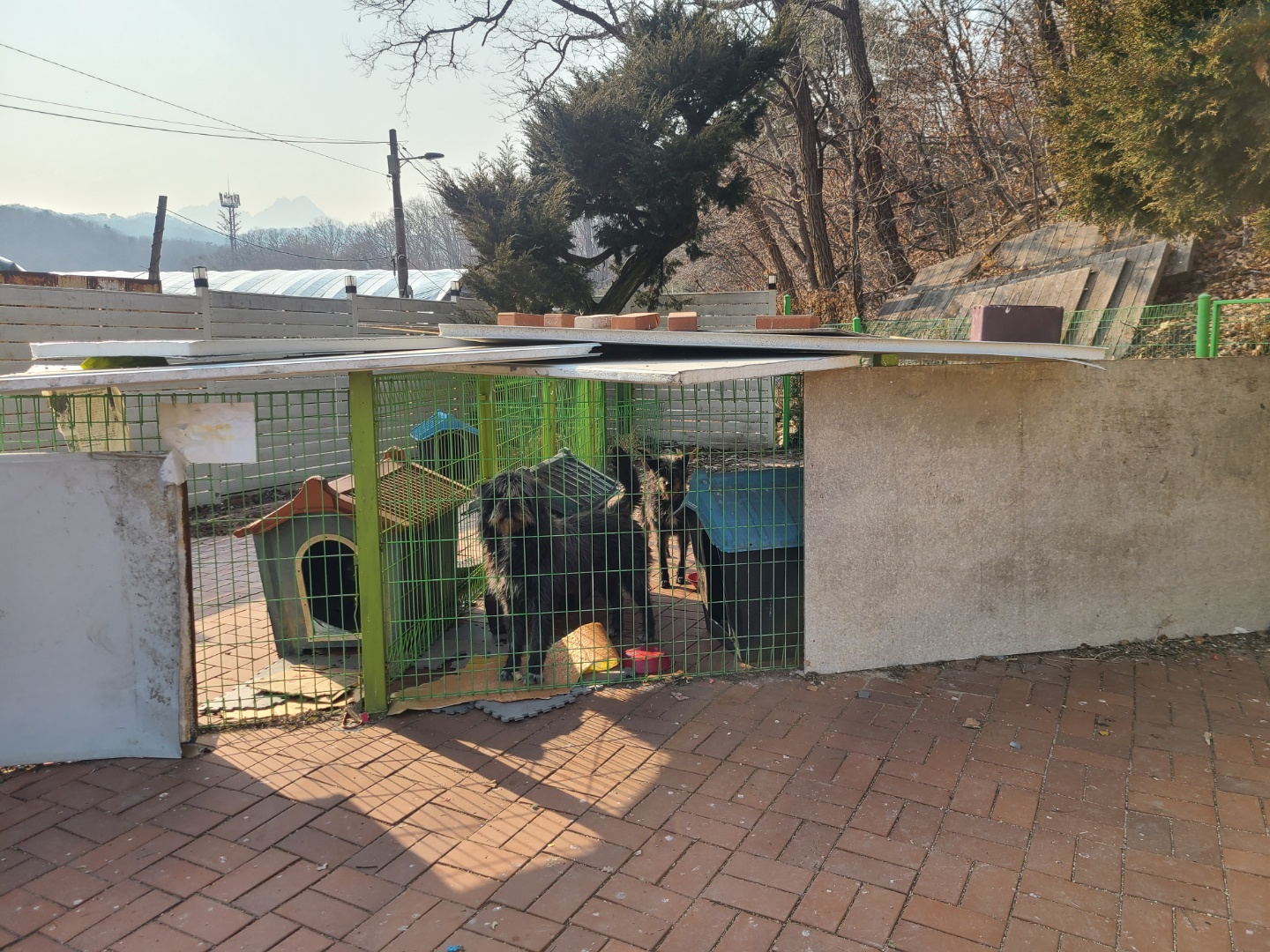 메이다이닝은 전용 주차장을 보유하고 있습니다. 주차장에는 개들이 있었습니다.