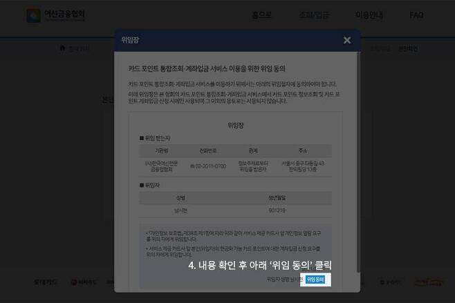 이후 카드 포인트 통합조회·계좌입금 서비스를 위한 위임동의에 확인하고, 아래 본인 성명 옆의 파란색 위임 동의를 누른 다음 주민등록번호 첫 자리를 제외한 뒷자리까지 입력이 끝나면 조회가 시작됩니다.