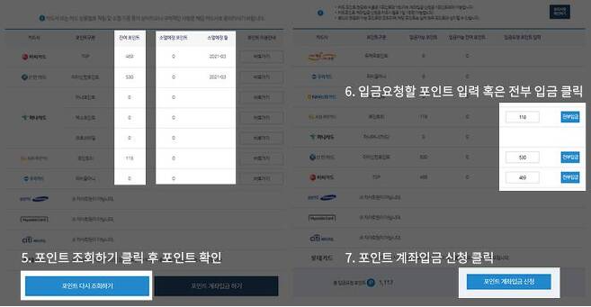 5) 포인트 조회와 입금을 요청할 포인트를 선택