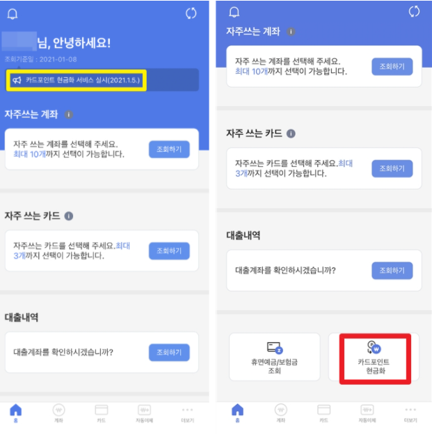 카드포인트 현금전환은 앱을 통해서도 가능합니다.