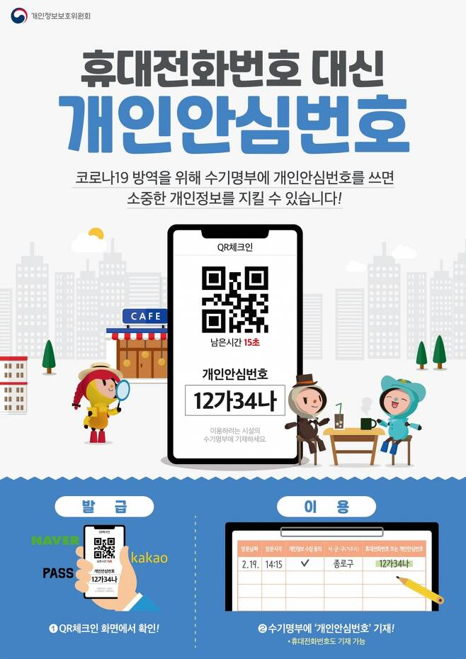 코로나 19에 따른 사회적 거리두기 시행으로, 식당이나 카페 등 다중이용시설에 방문하면 출입 명부를 작성하게 되어 있습니다. 전자출입 명부로 관리하는 곳에서는 QR 체크인을 하면 되지만, 수기(手記) 출입명부로 관리하는 곳에서는 휴대전화 번호를 남겼어야 했는데요. 이를 악용하여 개인정보가 유출되는 사례가 발생하였습니다. 이를 방지하기 위해 개인정보보호위원회에서는 '개인 안심번호'라는 것을 고안했는데요.
