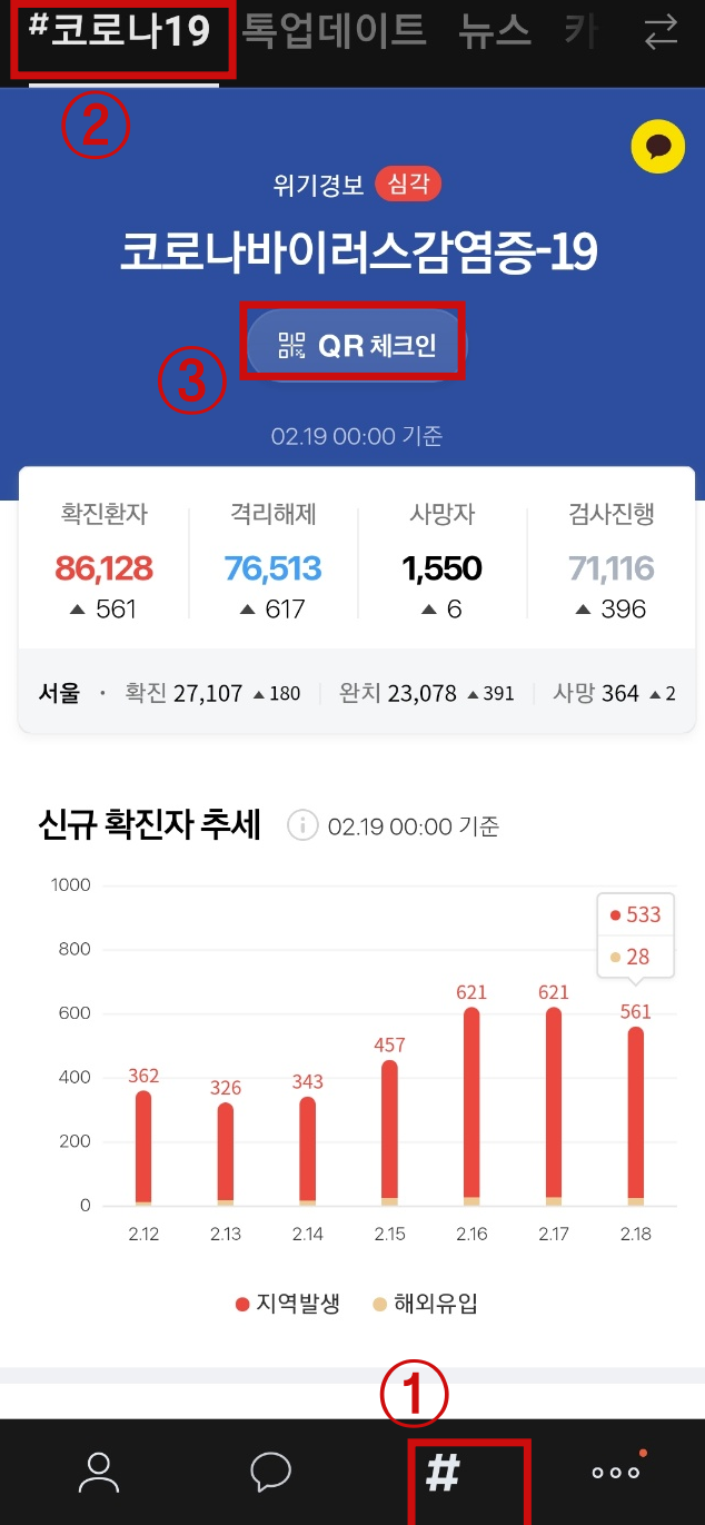 카카오톡 어플에 들어가셔서 오른쪽 하단의 # 버튼을 누르시고, #코로나 19를 선택하신 다음에 QR체크인을 누르면 됩니다. QR체크인을 아직 한 번도 이용하시지 않았다면, 휴대폰 번호 인증을 1회 진행해야 합니다. 아직까지 QR코드 밑에 개인 안심번호는 뜨지 않은 상태입니다.