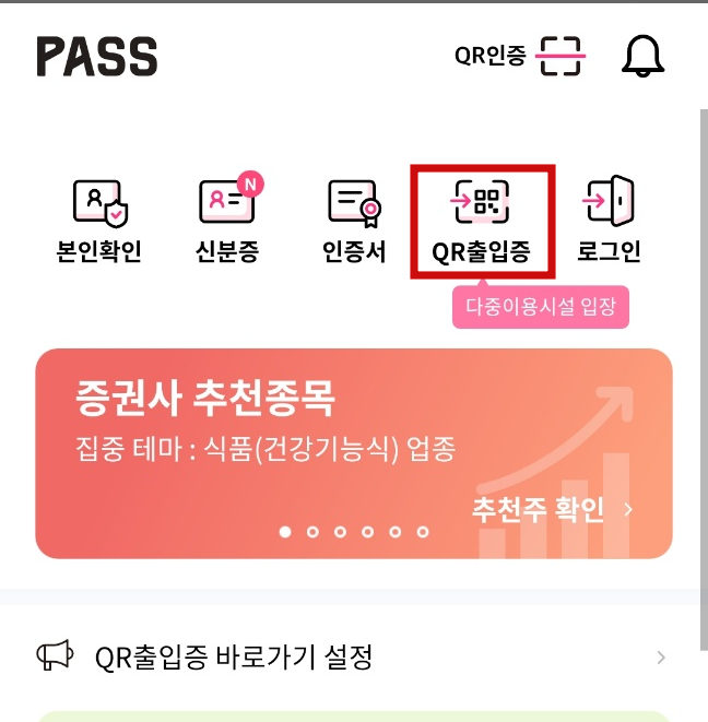 PASS도 동일합니다. 어플에 들어가셔서, QR출입증을 클릭하시면 됩니다. 최초 1회 휴대전화 인증을 받으셔야 합니다. PASS에서도 여전히 개인안심번호가 뜨지 않고 있습니다. 3개 어플 중에 편하신 것을 이용하시면 될 것 같습니다.