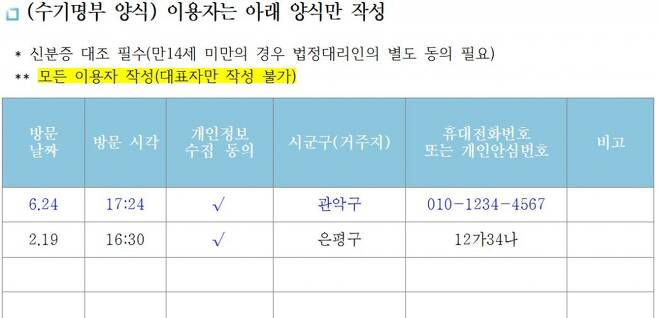 새로운 수기 출입 명부에는 개인 안심번호 외에 방문 일시, 시·군·구까지의 거주지만 적고, 개인정보 제공 동의에 체크하면 됩니다. 개인안심번호 발급이 꺼려지신다면 기존과 같이 휴대전화 번호를 적으셔도 됩니다. 전자출입 명부의 QR코드 방식을 사용해도 상관없습니다.