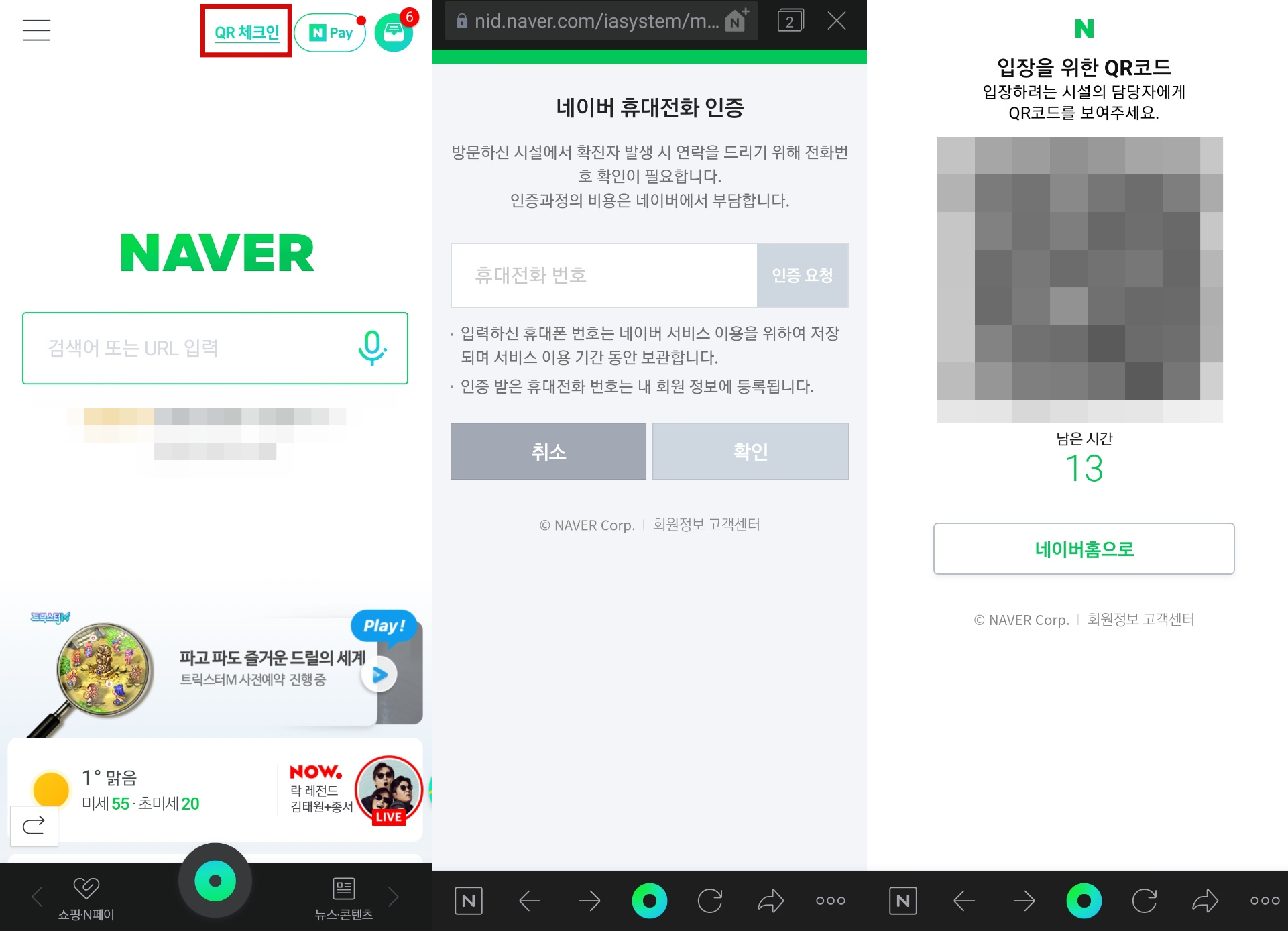 네이버 어플로 들어가시면 첫 화면 상단에 QR체크인이 있습니다. 처음 1회 휴대전화 인증을 받으시면 QR코드가 나옵니다. 아직까지 네이버도 개인 안심번호가 뜨지는 않습니다.