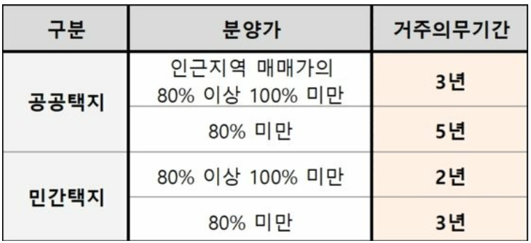 전월세 금지법에 따른 의무거주기간은 분양 가격에 따라 정해집니다. 민간택지의 경우 분양가가 주변 시세의 80% 미만일 경우 3년, 80~ 100% 사이일 경우 2년의 의무거주기간이 부여됩니다. 공공택지는 이보다 강화된 규정이 적용되는데요. 시세의 80% 미만은 5년, 80~100% 사이는 3년입니다.