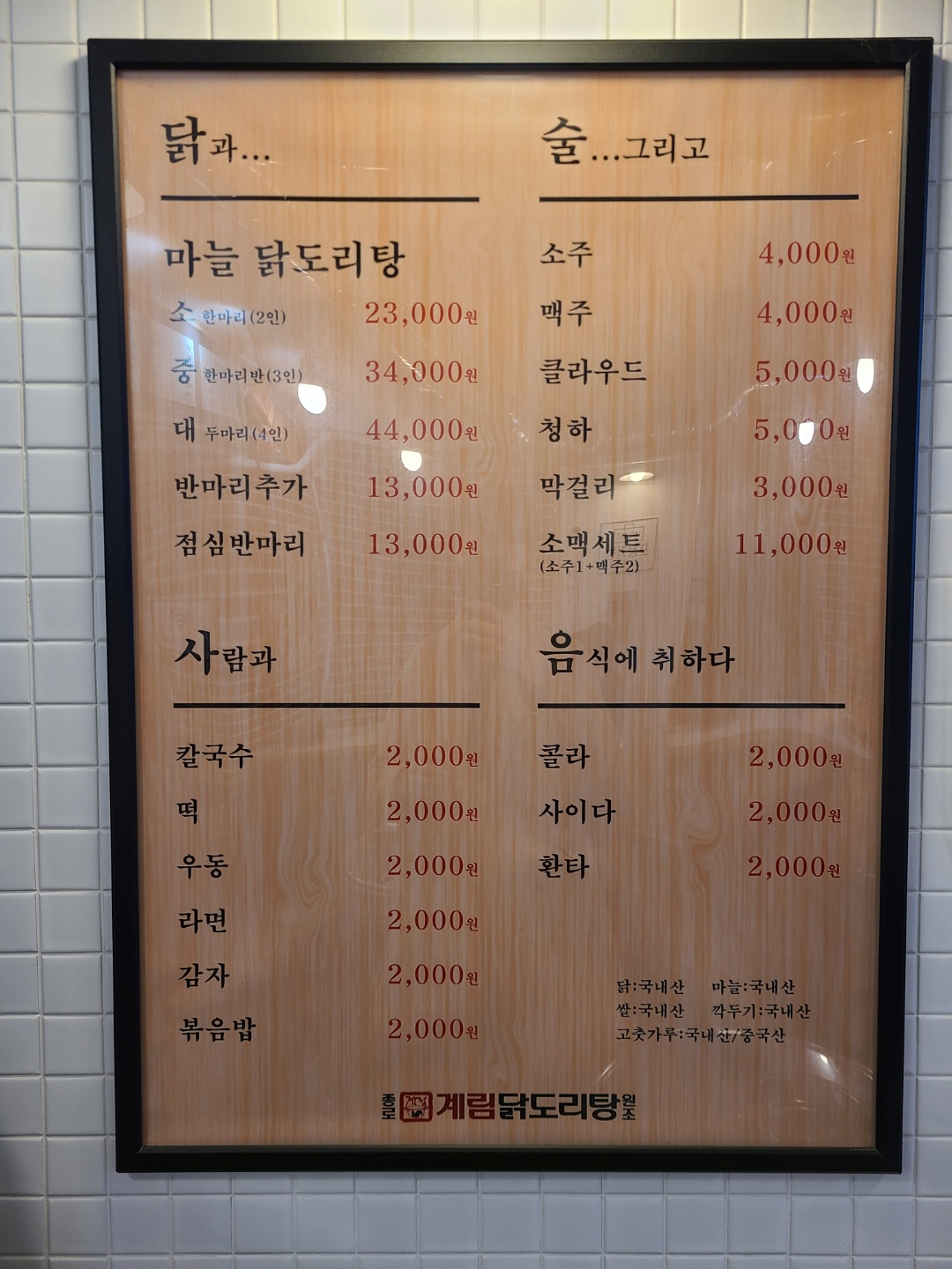종로 계림 닭도리탕원조 왕십리점 후기 : 가격(메뉴판)