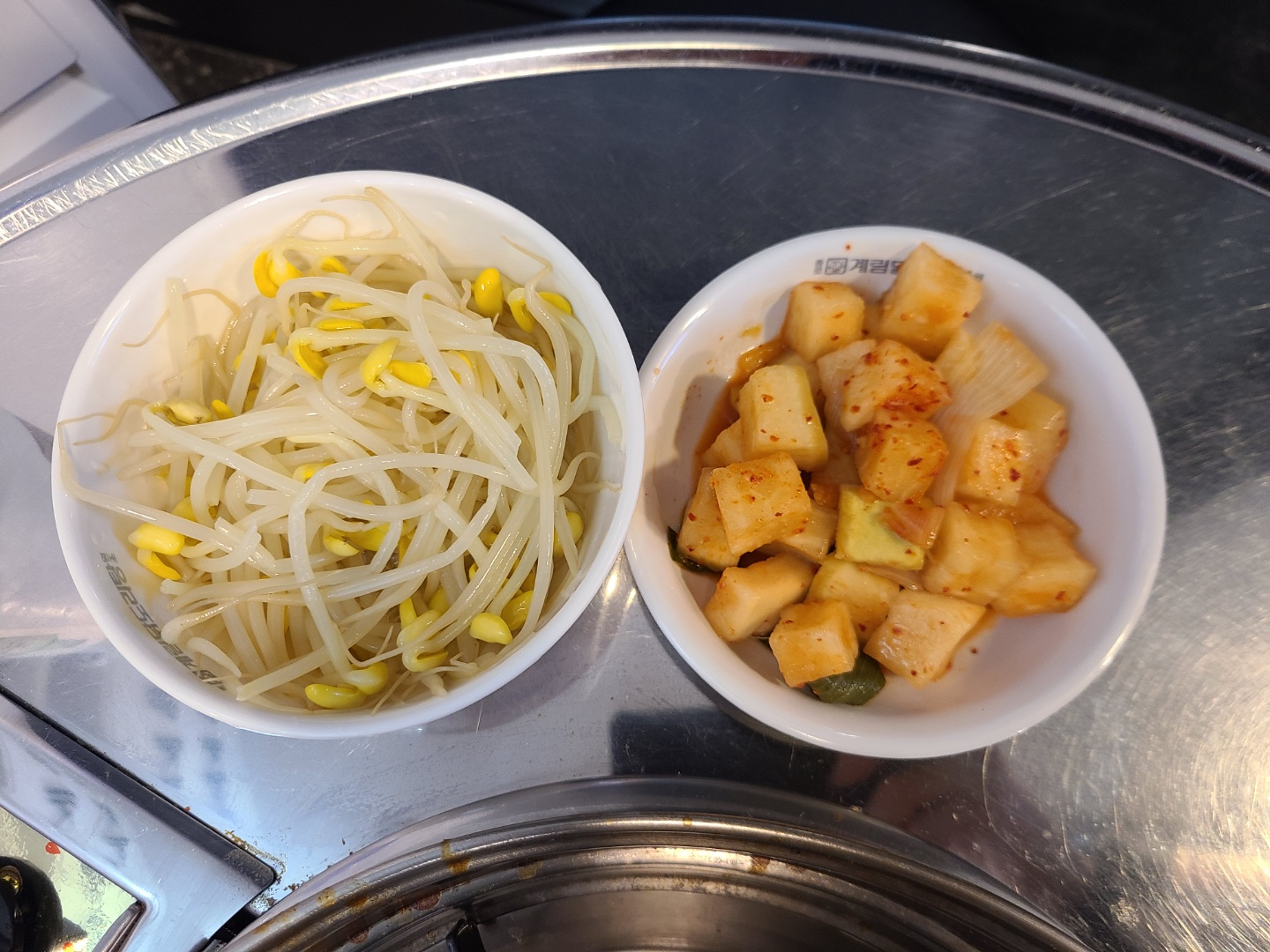 밑반찬은 콩나물 삶은 것과 깍두기 2개입니다. 셀프바가 있어서 부족하면 더 퍼먹을 수 있습니다.