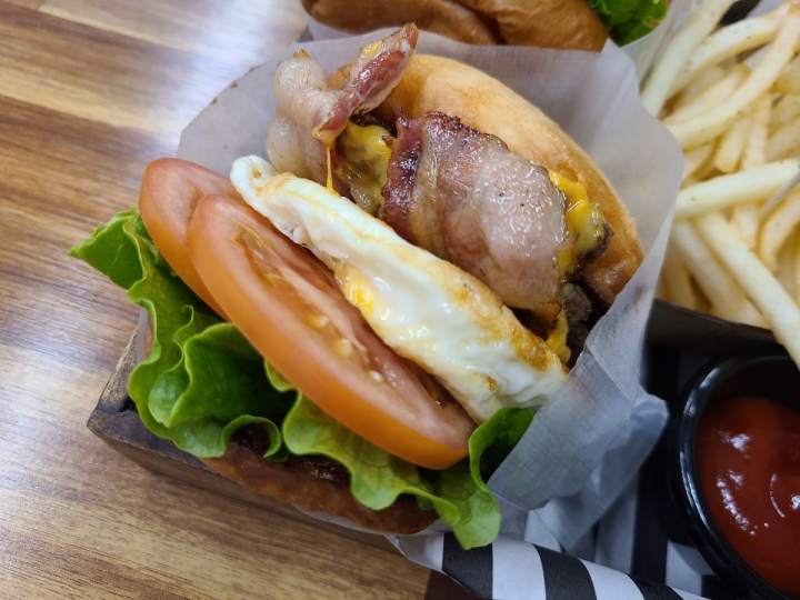 저희는 더블 치즈버거와 에그 베이컨 버거 세트를 시켰습니다. 사실 그냥 단품을 시켰는데, 2월 24일은 내부 공사 후 재오픈한 기념으로 모두 세트로 업그레이드 해줬습니다.