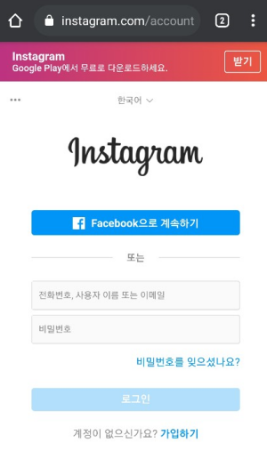 여기서 다시 한번 인스타그램 로그인을 해야 합니다. 저는 ID와 비밀번호를 잊어버려서 조금 힘들었습니다.