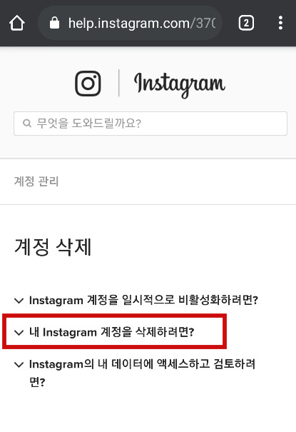 여기서 계정을 일시적으로 비활성화할 수도 있고, 영구 삭제할 수도 있습니다. 두 번째 내 인스타그램 계정을 삭제하려면을 누릅니다.