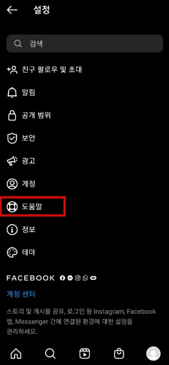 다음으로 여기서 도움말을 눌러야 합니다. 보통 계정을 눌러야 탈퇴나 계정 삭제가 나올 것 같은데요. 인스타그램은 도움말로 들어가 고객센터에 들어가야 합니다.