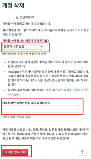 여기서 계정을 일시적으로 비활성화할 수도 있고, 영구 삭제할 수도 있습니다. 두 번째 내 인스타그램 계정을 삭제하려면을 누릅니다.