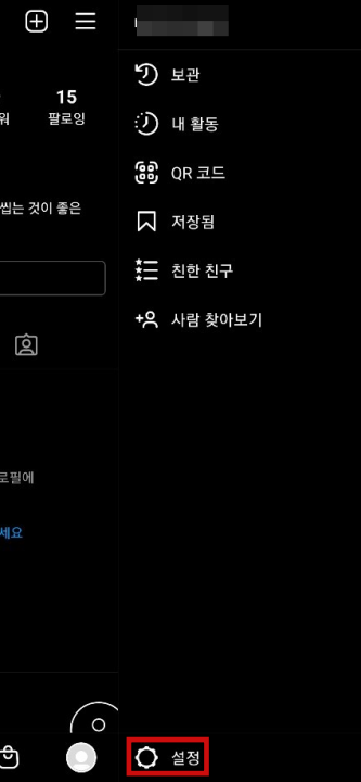 3줄을 눌렀으면 아래쪽에 설정을 누릅니다.