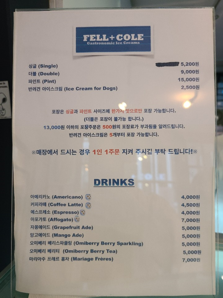 상수 젤라또 맛집 펠앤콜(Fell+Cole) : 가격(메뉴판)