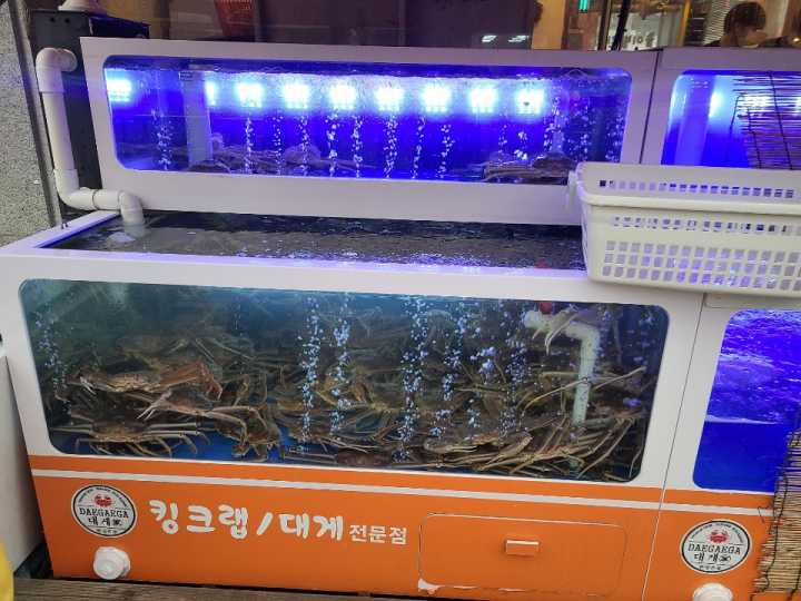 대게가는 킹크랩과 대게를 수조앞에서 무게를 달아주는 시스템입니다. 이 자리에서 무게를 말씀하시거나, 게를 직접 선택하시면 됩니다. 사장님께서 특정 무게로 유도하지 않으시고 자유롭게 고르게 해주시니, 자신이 먹을만큼만 먹으면 될 것 같습니다.