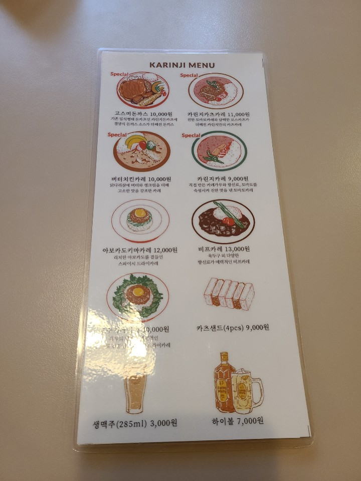 성수동 카린지 가격(메뉴판)