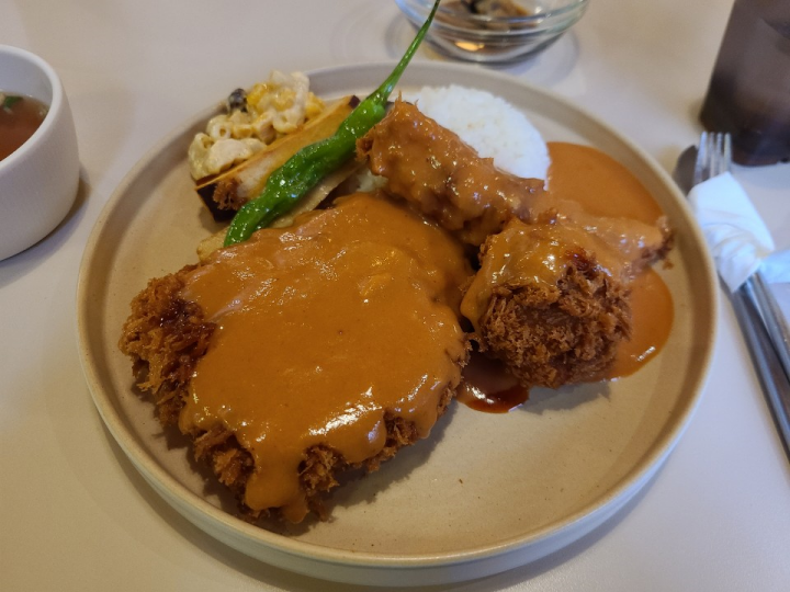 고스미돈까스는 일식 돈까스에 경양식 소스를 뿌린 돈까습입니다. 돈까스는 제가 좋아하는 스타일로 빵가루가 풍부한 일식 돈까스였습니다. 소스가 뿌려졌는데도 바삭함이 잘 유지되었습니다. 소스는 그냥 경양식 소스와는 다르게 살짝 매콤했습니다. 아주 맛있는 소스였습니다.