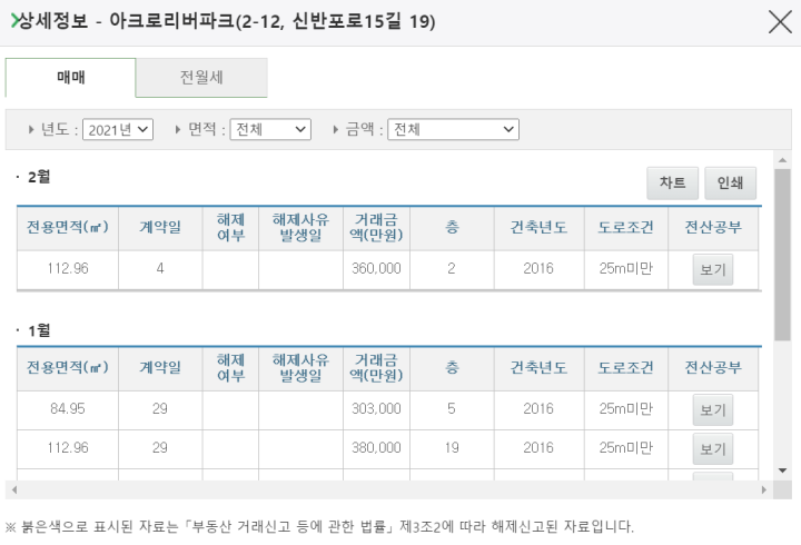 저는 아크로리버파크를 검색해봤습니다. 2021년 2월 4일 36억에 2층 112.96제곱미터가 거래된 것을 확인할 수 있었습니다. 매매뿐만 아니라 전월세의 실거래가도 공개되기 때문에 큰 도움이 되었는데요. 전세의 경우 계약갱신청구권을 사용한 가격대와 신규 입주한 전세 가격대가 큰 차이를 보이고 있습니다. 이점은 주의해서, 전세 실거래가를 조금 걸러보실 필요가 있습니다.