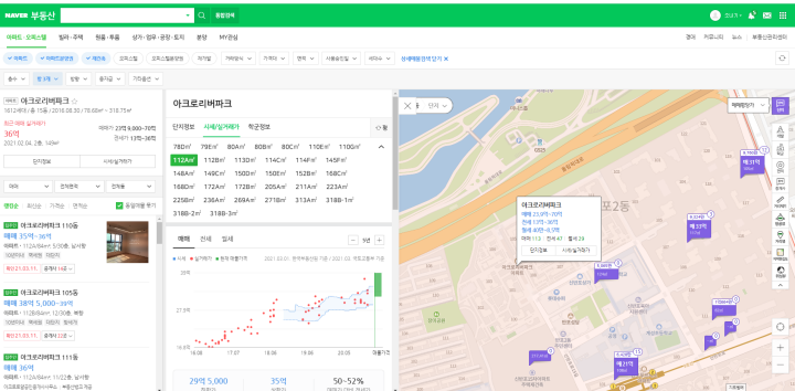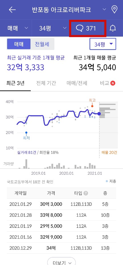 저는 아크로리버파크를 검색해봤습니다. 2021년 2월 4일 36억에 2층 112.96제곱미터가 거래된 것을 확인할 수 있었습니다. 매매뿐만 아니라 전월세의 실거래가도 공개되기 때문에 큰 도움이 되었는데요. 전세의 경우 계약갱신청구권을 사용한 가격대와 신규 입주한 전세 가격대가 큰 차이를 보이고 있습니다. 이점은 주의해서, 전세 실거래가를 조금 걸러보실 필요가 있습니다.