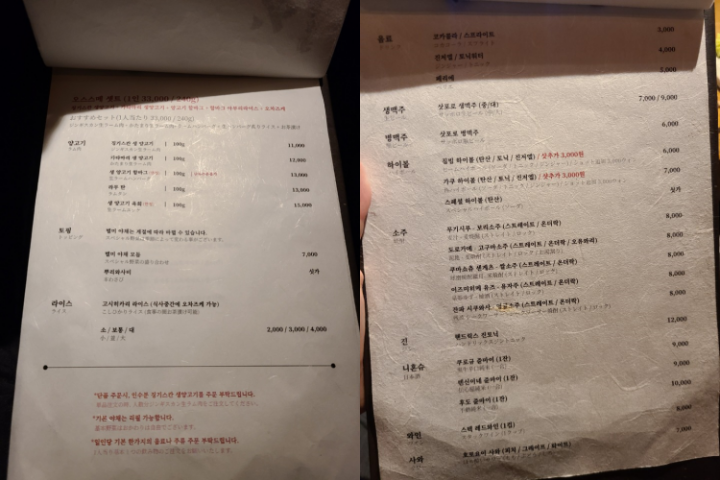 메뉴는 오스스메 세트가 1인 33,000원입니다. 기타 양고기는 100g씩 추가해서 시킬 수 있습니다. 테이블링 예약을 할 경우 오스스메 세트로 주문이 되고, 1인 1잔의 음료를 시켜야합니다.