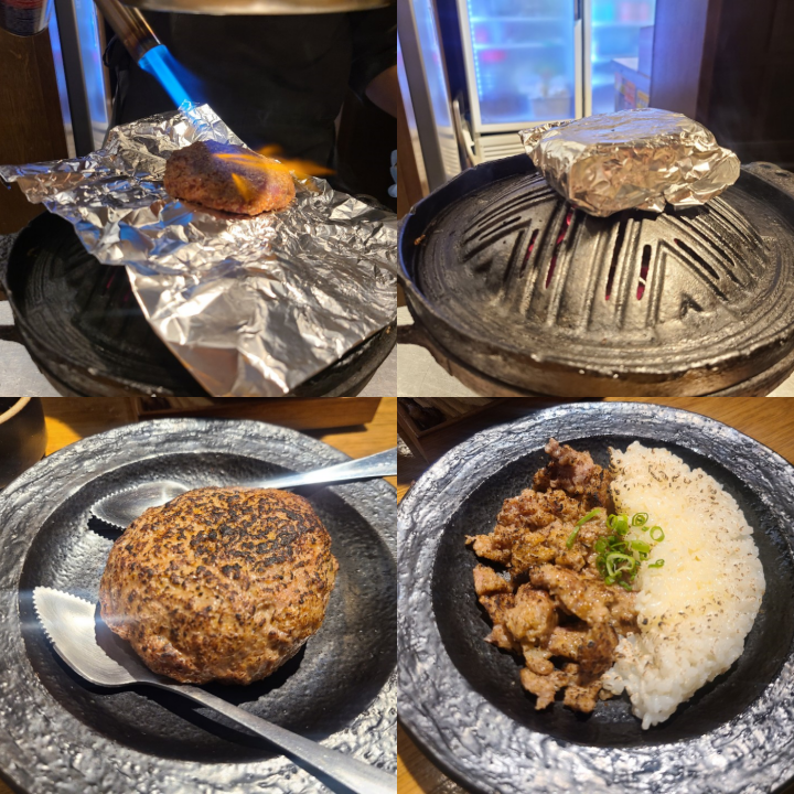 마지막으로 가장 기대했었던, 생 양고기 함바그가 나옵니다. 토치로 불맛을 내주시는데요. 약간 쯔란과 같은 향신료가 들어간 함바그 같았습니다. 향신료의 매콤한 맛과 부드러운 양함바그가 정말 잘어울렸습니다. 1/3 정도 남았을 때 아부리 라이스로 만들어 주셨는데, 버터와 함께 먹으니 풍미가 장난 아니었습니다.