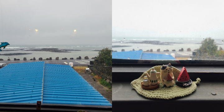 창 밖으로 구좌읍의 예쁜 바다가 보여서 정말 좋았습니다. 창가에도 귀여운 고양이 소품이 올려져 있었습니다.