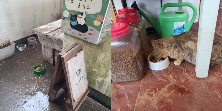 사장님께서 고양이를 정말 사랑하시는 것 같습니다. 소품들에도 고양이가 주인공인게 많았고, 고양이 급식소도 운영하고 계십니다. 이날은 비가와서 고양이가 가게 안에 들어와 밥을 먹었습니다.