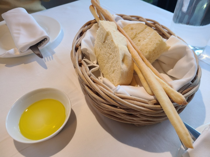 식전빵과 과자를 주십니다. 올리브유에는 별도로 발사믹 식초가 뿌려져 있지 않습니다. 빵은 간이 전혀 되어있지 않는 무색무취의 빵입니다. 올리브유 본연의 맛을 즐길 수 있는 깔끔한 식전빵이었습니다.