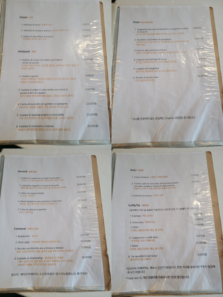 모디카는 스프와 전체요리, 파스타, 육규/생선, 디져트로 이어지는 코스 요리를 판매합니다. 단품의 가격은 파스타가 2만원 대로 아주 비싼 편은 아닙니다.