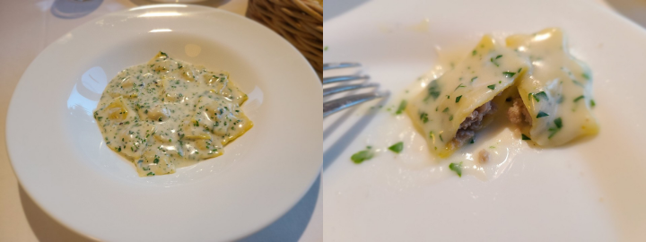 이탈리아의 만두가 라비올레입니다. 이런 라비올레를 작게 만든 것을 라비올레띠라고 하는데요. 밀가루 베이스의 넒은 파스타면 안에 돼지고기와 소고기로 속을 채운 정말 작은 만두라고 보시면 됩니다. 여기에 치즈가 들어간 크림소스로 파스타를 만들었는데요. 크림소스는 마치 고르곤졸라처럼 꼬릿한 향이 나는 치즈향이 났습니다. 아마도 피르미지아노 치즈가 블루치즈인것 같습니다. 아주 찐득한 소스가 매력적인 파스타였습니다.